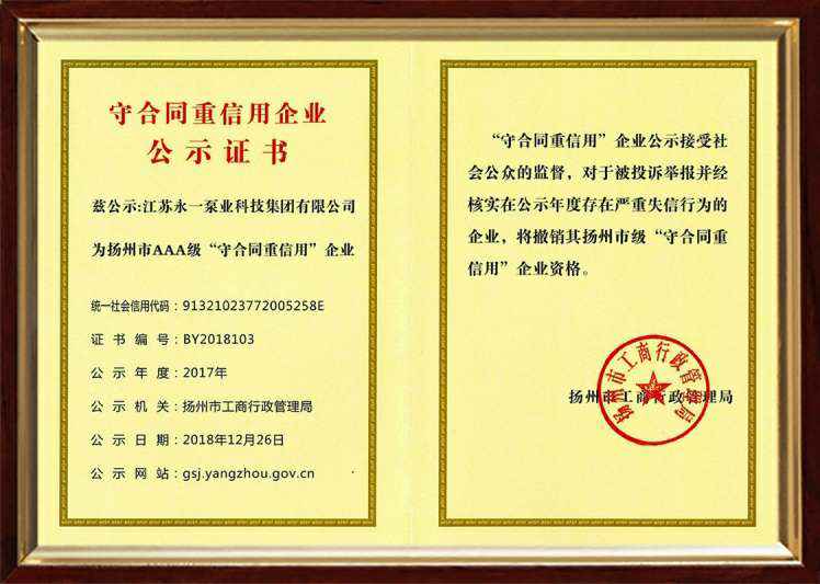 扬州市信用管理示范企业证书